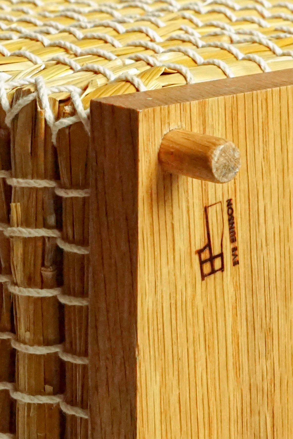 ‘My straw baskets are made using the knotting technique used in the critically endangered craft of Fair Isle Strawback Chair making,’ Eve says. ‘They are made from hand-harvested straw. The large one was made in Orkney and was from straw grown there. It is the first piece I ever made and features an oak base with oak corner dowels. The small one is woven with straw from Shetland Black Aets and has a base of reclaimed oak with walnut pin details.’