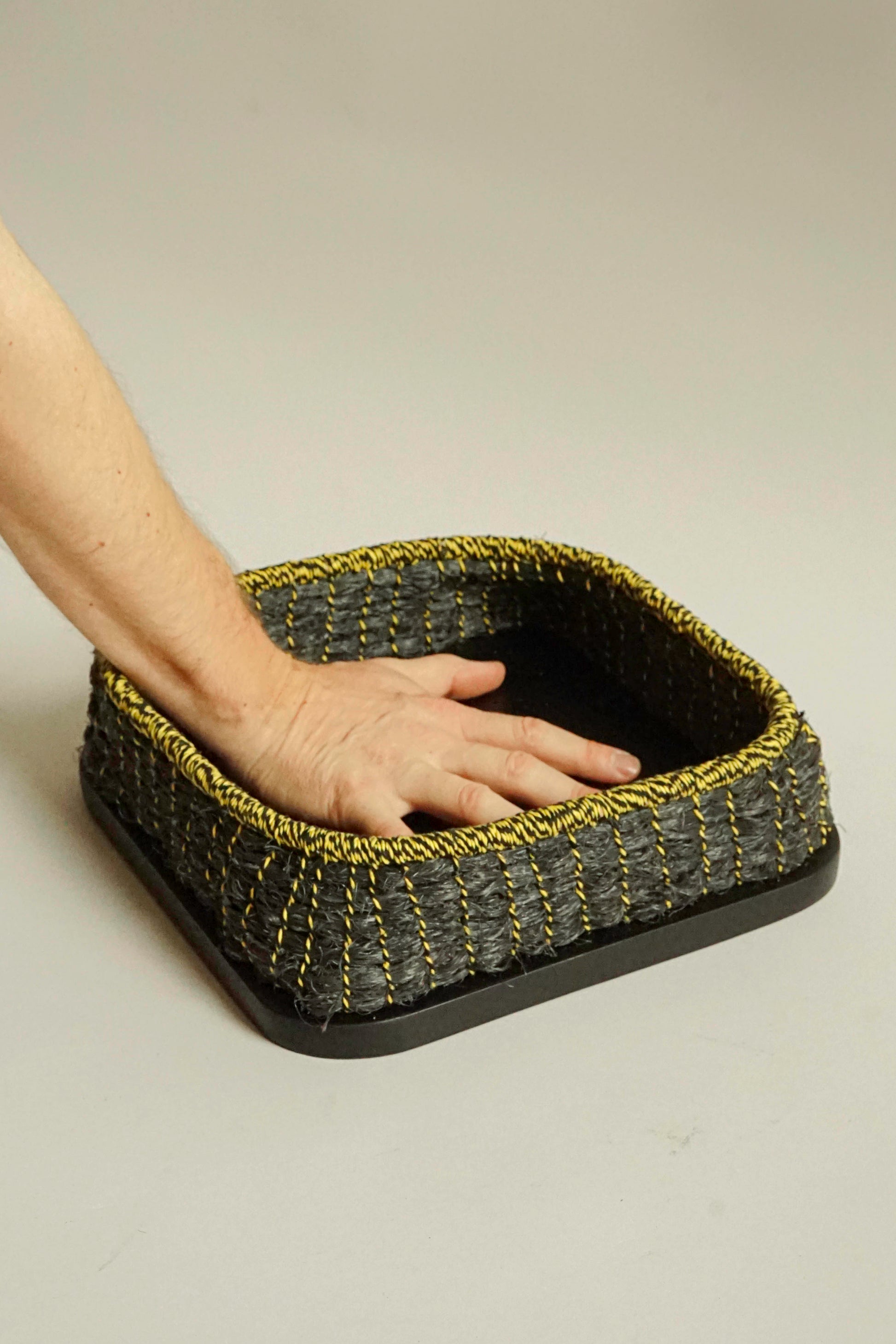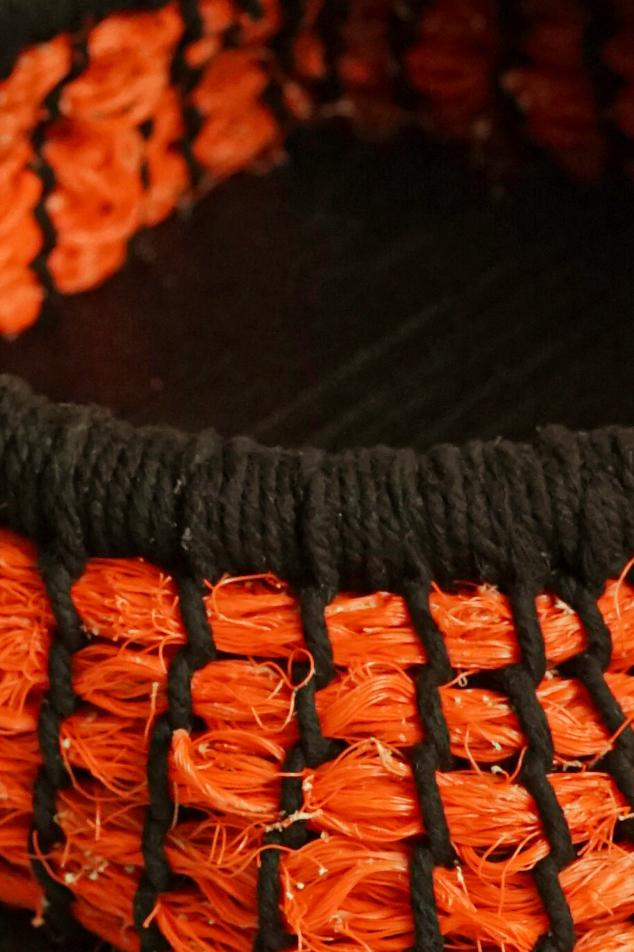 Eve’s ghost rope baskets are made of synthetic rope, discarded by the aquaculture and fishing industries and washed up along Shetland's beautiful coastline. ‘These particular ropes - the orange and the black - were gathered from the shores of the stunning Whiteness Voe in the west of Shetland,’ Eve explains. ‘It’s really satisfying to take this material out of the natural environment and to turn it into something beautiful. I use the same knotting technique for the baskets as in the critically endangered craft of Fair Isle Strawback Chair making. I've paired the rope with bases of reclaimed timber. The timber has been upcycled from antique furniture pieces, which have been ebonised using Indian ink. It has always been difficult and expensive to get new hardwood timber in Shetland, so there is a deep-rooted obsession amongst woodworkers in the islands to salvage and re-purpose good quality hard woods.’