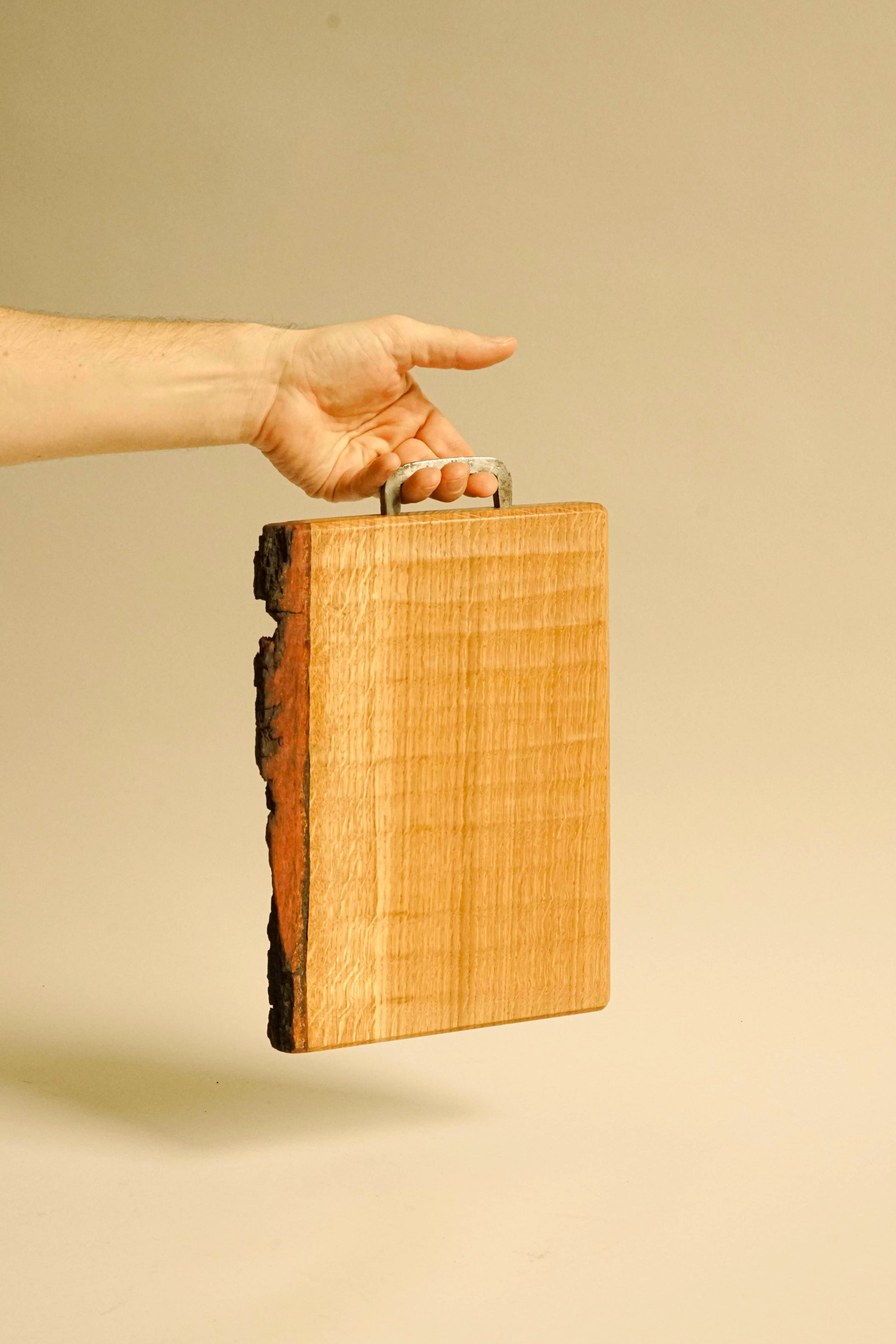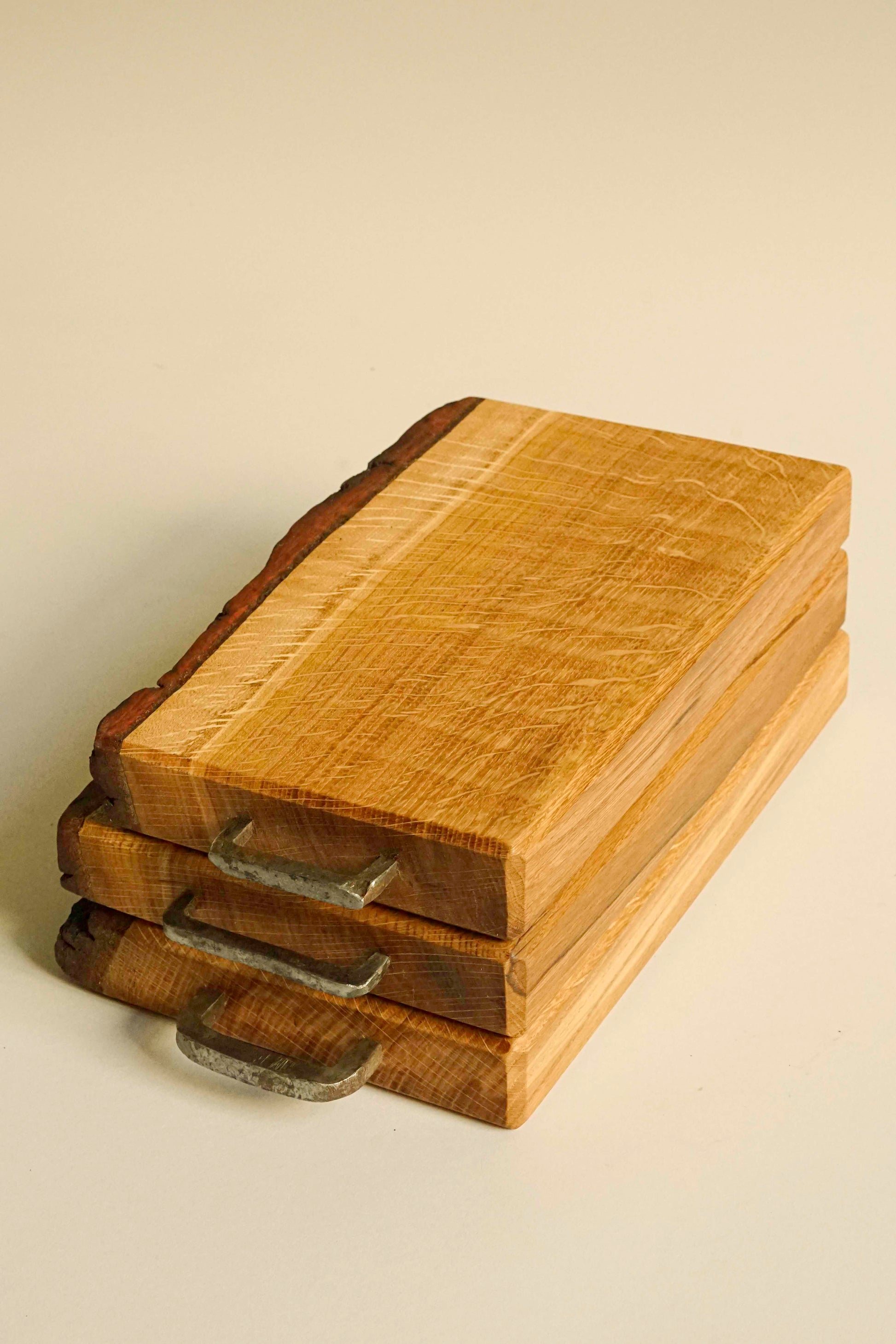 Simple, characterful and functional oak serving boards. The texture of the boards comes from a travisher - a traditional tool used in chairmaking and cask building. The scalloped surface the tools leaves is rarely seen, as its more usually smoothed over. ‘My boards celebrate this as one of many textures the maker sees but the end user might not,’ Jonnie explains.